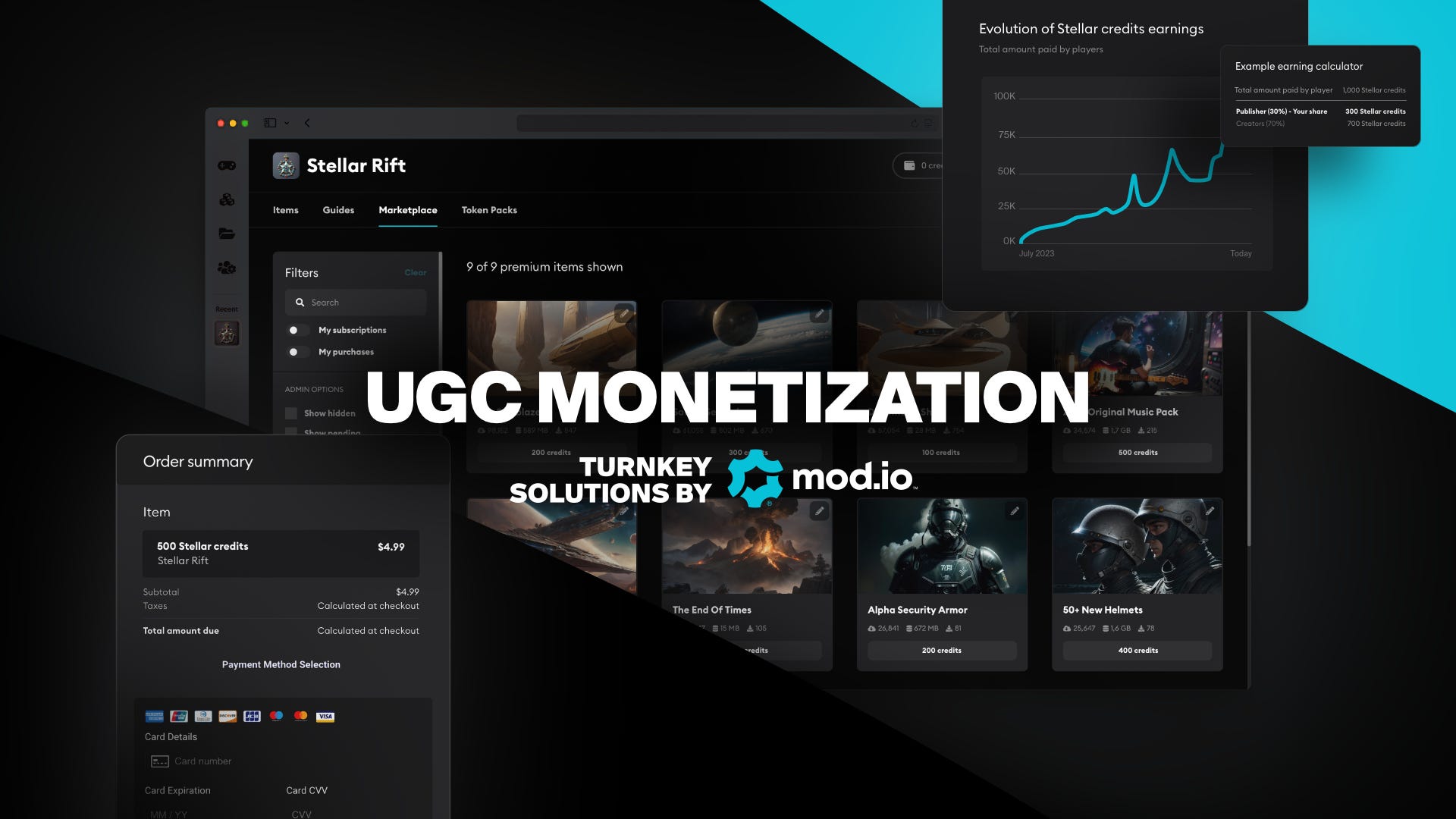 Monetization has always been a critical, if challenging, building block in our offer of services. Solving the technical, regulatory and compliance issues to provide a service ready to integrate for any game represented a major endeavor. Now, after more than three years of development alongside other mod․io services, we’re super proud to make marketplace, our first UGC monetization service, available for integration.