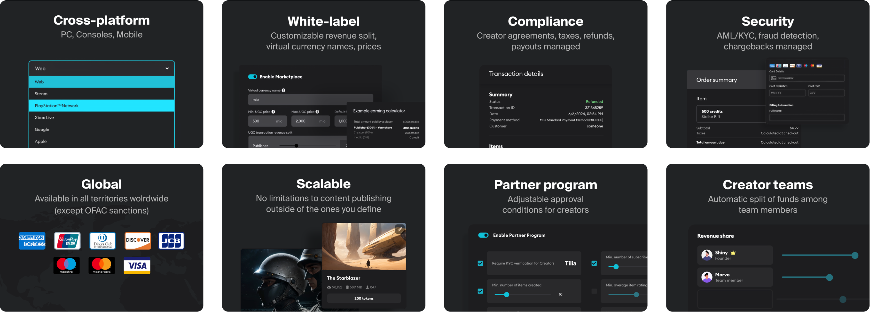 It’s a turnkey solution, ready for integration on most platforms; and coming out of the box with a large set of advanced features. Everything related to compliance, security, and payouts is managed by our backend. It’s available globally, allows creators to self-onboard and offers a high level of flexibility for content approval and moderation.